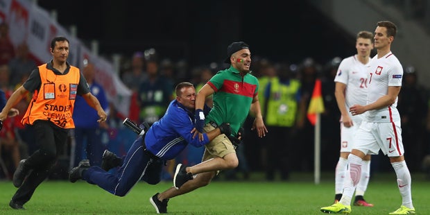 Es lief gerade die 110. Minute im EURO-Viertelfinale, als ein portugiesischer Fan seinen Stars etwas zu nahe sein wollte. In kurzer Hose, mit Portugal-Shirt und den Landesfarben im Gesicht stürmte er den Rasen.