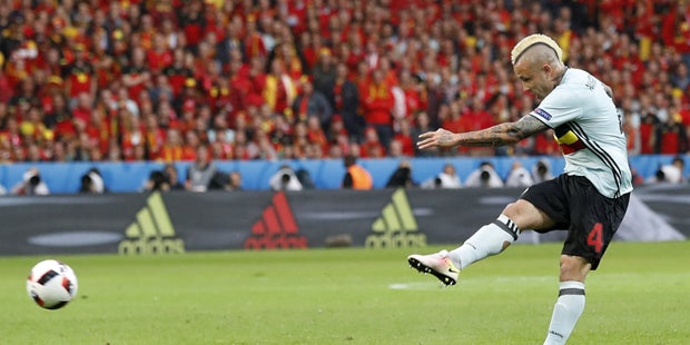 Dass er aber auch ein Klasse-Fußballer ist, beweist Nainggolan im EM-Viertelfinale gegen Wales. Der Roma-Spieler bekommt in der 13. Minute links knapp 25 Meter vor dem Tor die Kugel vor den Fuß gelegt, nimmt sofort Maß und knallt das Spielgerät perfekt links ins Eck.