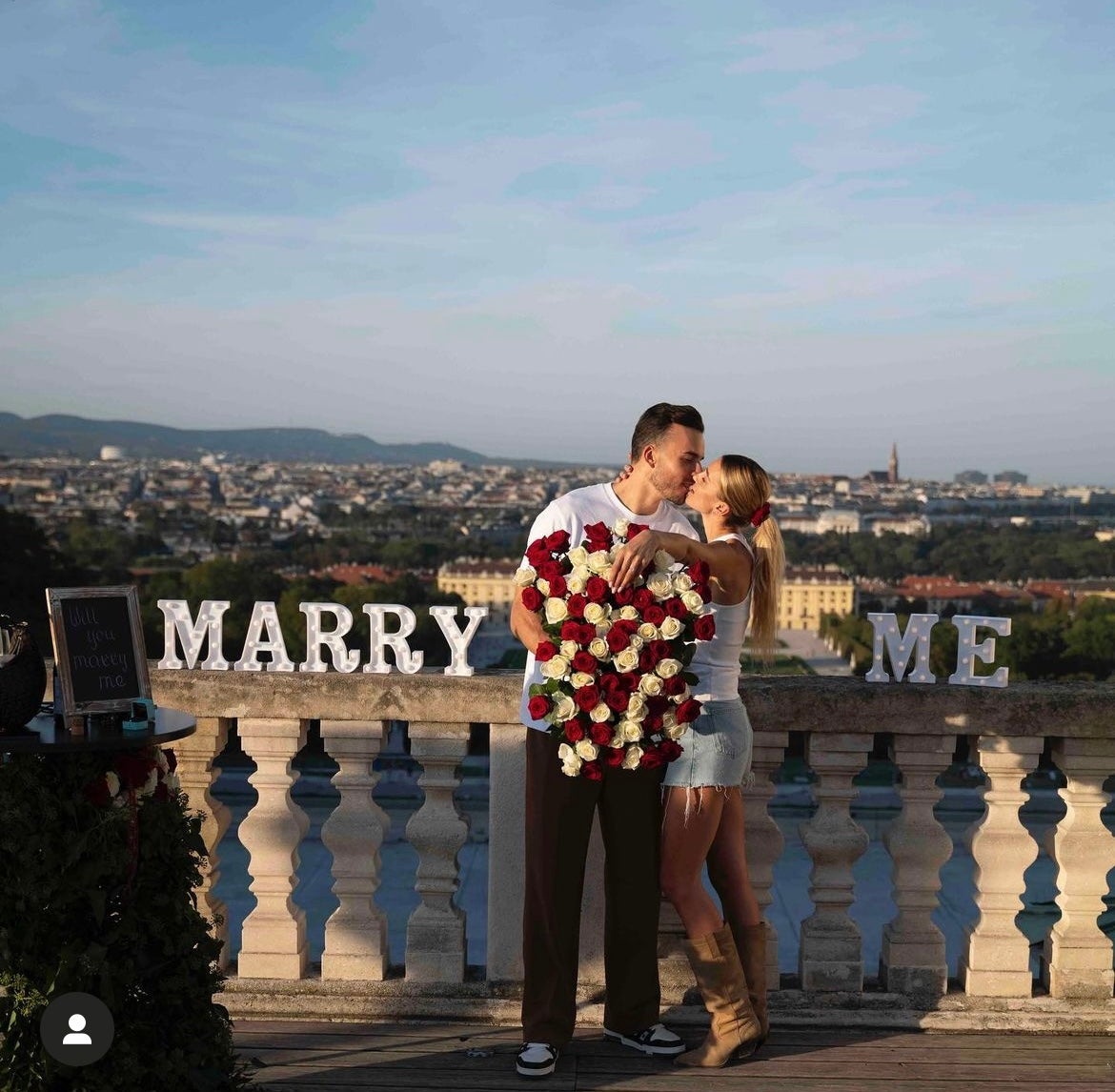 Auf dem Schnappschuss zu sehen: ein riesiger Rosen-Strauß, die frisch Verlobten eng umschlungen und die Frage aller Fragen "Heirate mich". Unter dem Beitrag schrieb Tabakovic: "Du & Ich für immer." Dabei strahlten beide über das ganze Gesicht und ließen über den Dächern von Wien sogar die Korken knallen.