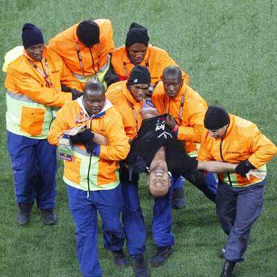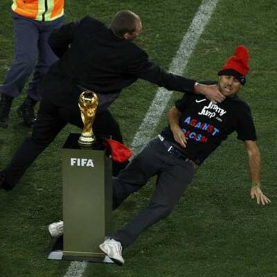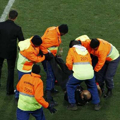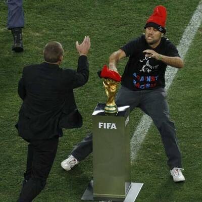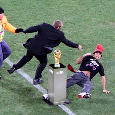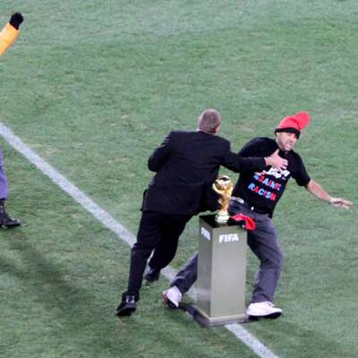 Ein spanischer Fußballfan ist am Sonntagabend unmittelbar vor dem Einmarsch der Mannschaften zum WM-Finale zwischen Spanien und den Niederlanden im Soccer-City-Stadion von Johannesburg auf den Platz gestürmt. Der Mann rannte in Richtung des auf einem Podest präsentierten WM-Pokals und wurde erst kurz davor von einem halben Dutzend Sicherheitskräften überwältigt und abgeführt.
