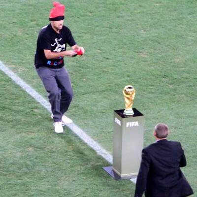 Notorischer Flitzer "Jimmy Jump" schmückte WM-Pokal mit roter Haube.