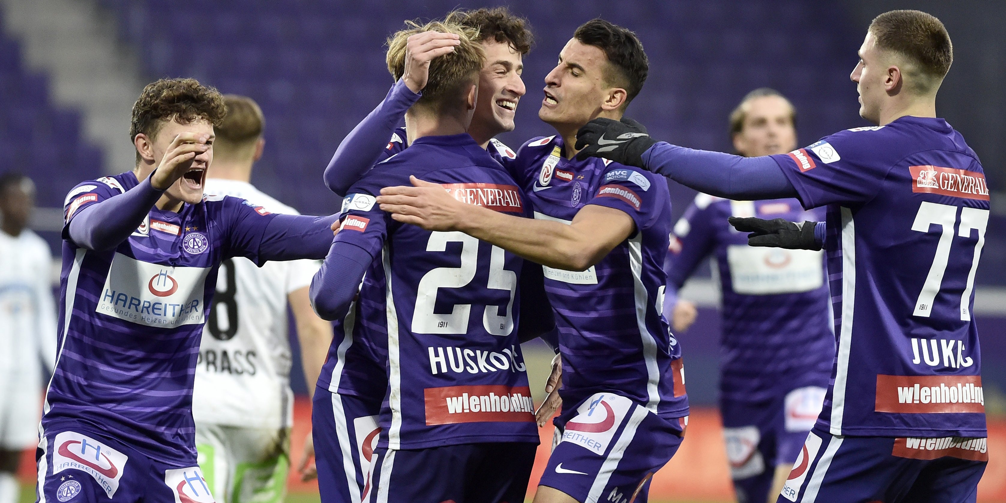 Die Wiener Austria hat die Leidenszeit von Sturm Graz verlängert und selbst drei wichtige Punkte im Rennen um die Top sechs in der Fußball-Bundesliga eingefahren. Beim 2:1 am Sonntag erzielten Muharem Huskovic (48.) und Aleksandar Jukic (76.) die Tore für die "Veilchen", Ex-Austrianer Manprit Sarkaria konnte für die eine halbe Stunde lang in Unterzahl spielenden Grazer nur verkürzen (81.).