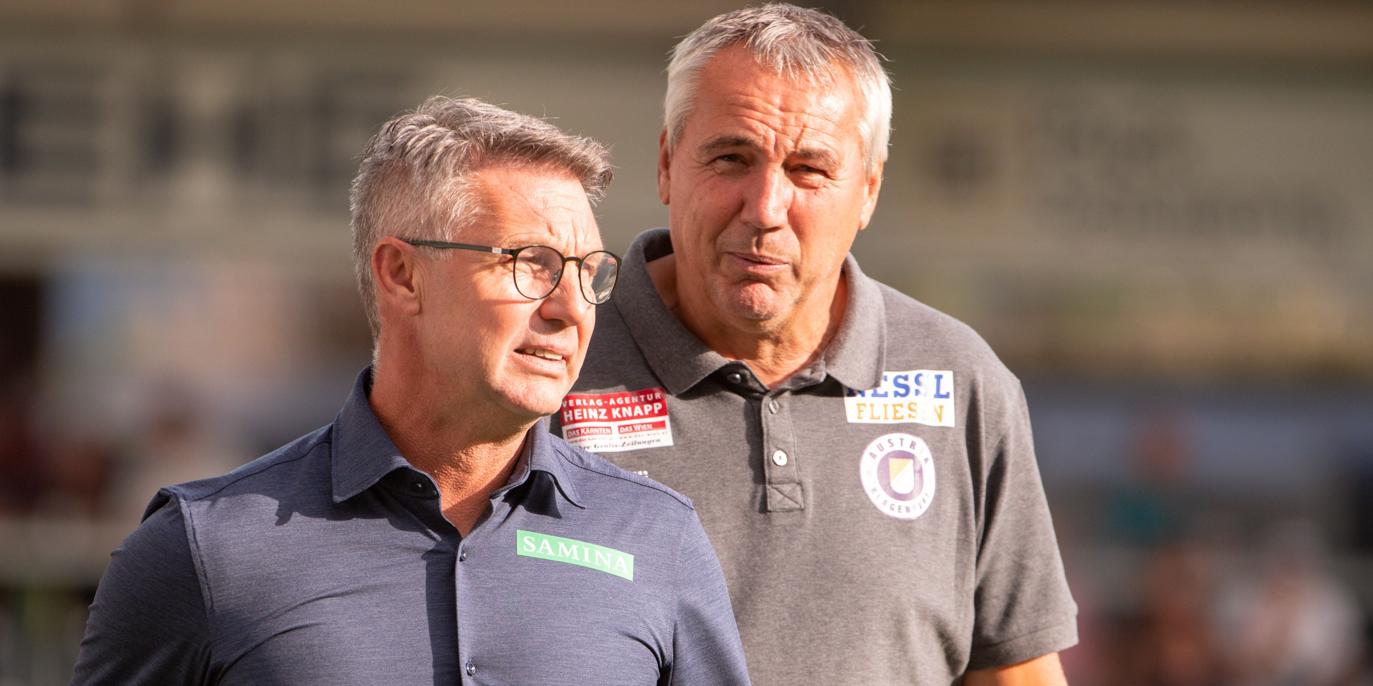 Im Duell der Kult-Trainer jubelt Peter Pacult mit seiner Austria Klagenfurt über einen klaren 4:-Sieg gegen Damit Canadis Altacher.