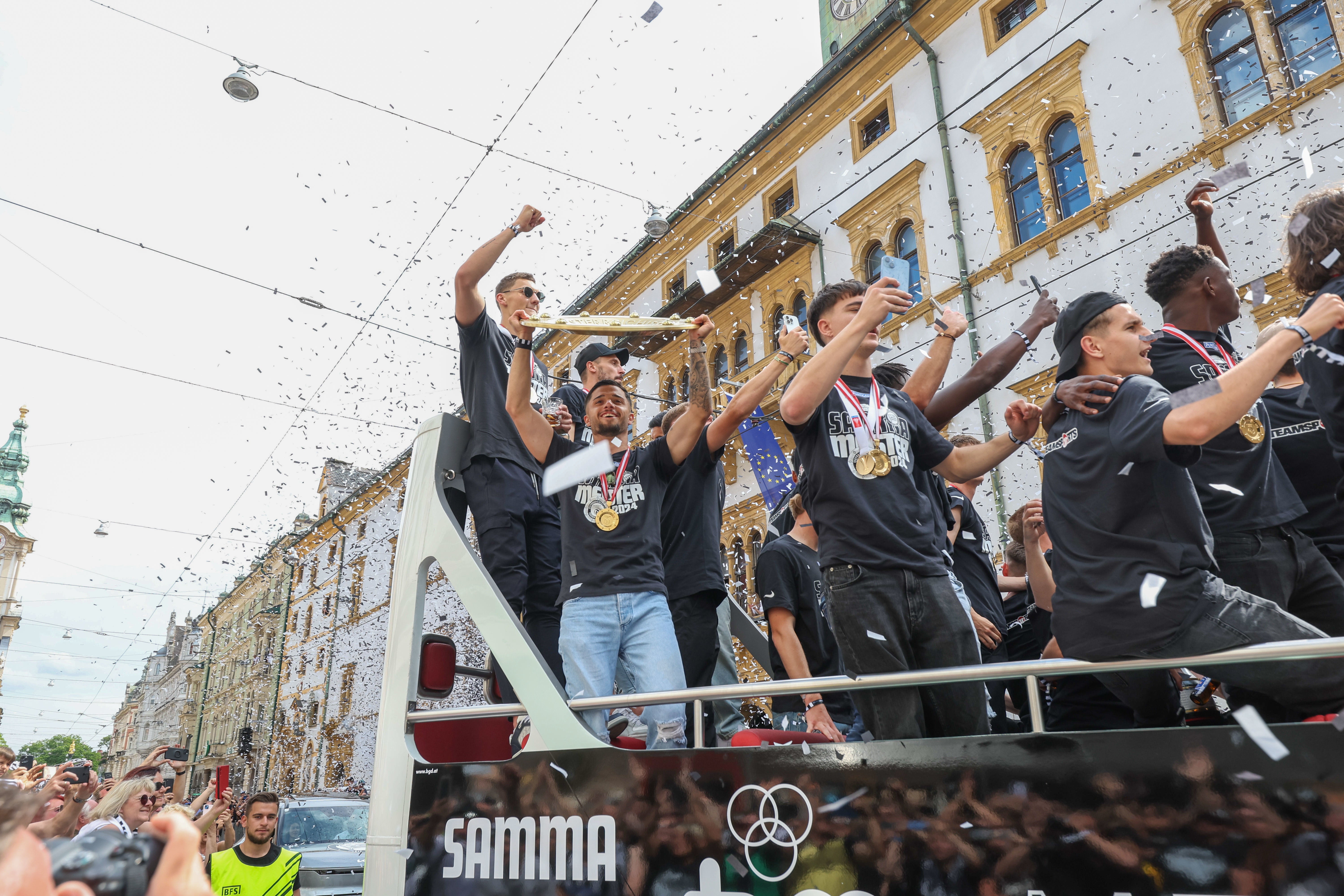 22 Stunden nach der Thriller-Entscheidung um den Titel- und damit den zweiten Double-Gewinn versetzten die Sturm-Graz-Helden die steirische Hauptstadt in Ausnahmezustand.