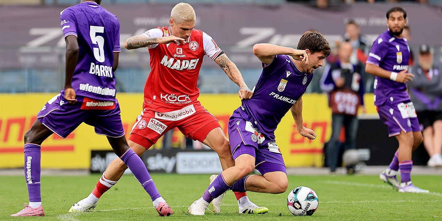 Trotz 5:0-Erfolg in der Conference-League-Quali gegen Spaeri bleibt der Saisonstart der Austria durchwachsen. Nach dem blamablen Cup-Aus gegen Voitsberg (2:3) gab es zum Ligaauftakt beim GAK in Graz ein 2:2 (1:1).