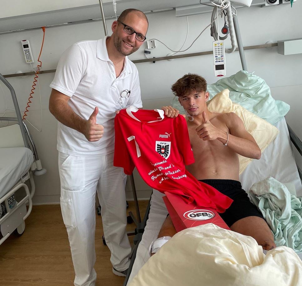 „Muki“ zog sich einen Kreuzbandriss, eine Gehirnerschütterung und eine Milz-Ruptur zu, wurde operiert und in künstlichem Tiefschlaf versetzt. Inzwischen konnte der Kicker die Intensiv-Station wieder verlassen. Am Montag bekam er bereits Besuch: U16-Teamarzt Thomas Laimer ein Trikot mit Genesungswünschen im Namen des ÖFB.