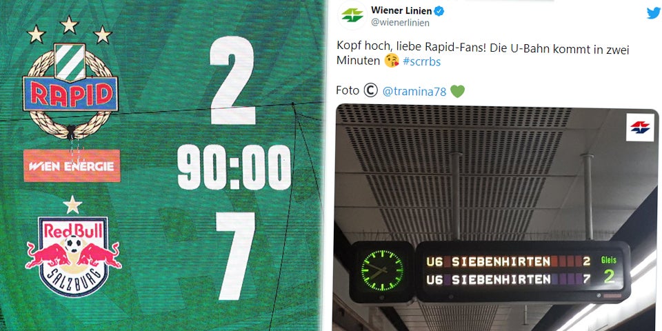"Kopf hoch, liebe Rapid-Fans. Die U-Bahn kommt in zwei Minuten", posteten die Wiener Linien auf Twitter, gemeinsam mit einem Foto von den Wartezeiten der U6. Die beiden Ziffern 2 und 7 leuchten dabei auf den Anzeigetafeln, ähnlich wie im Allianz Stadion.