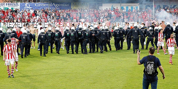 Die wilde Meute aus Graz demolierte Tribünen, Banden und Sanitäranlagen. Eine Klomuschel wurde aus der Verankerung gerissen und aufs Spielfeld geschleudert. Erst um 23 Uhr, mehr als zwei Stunden nach Beginn der Ausschreitungen, hatte man die Situation wieder halbwegs unter Kontrolle.