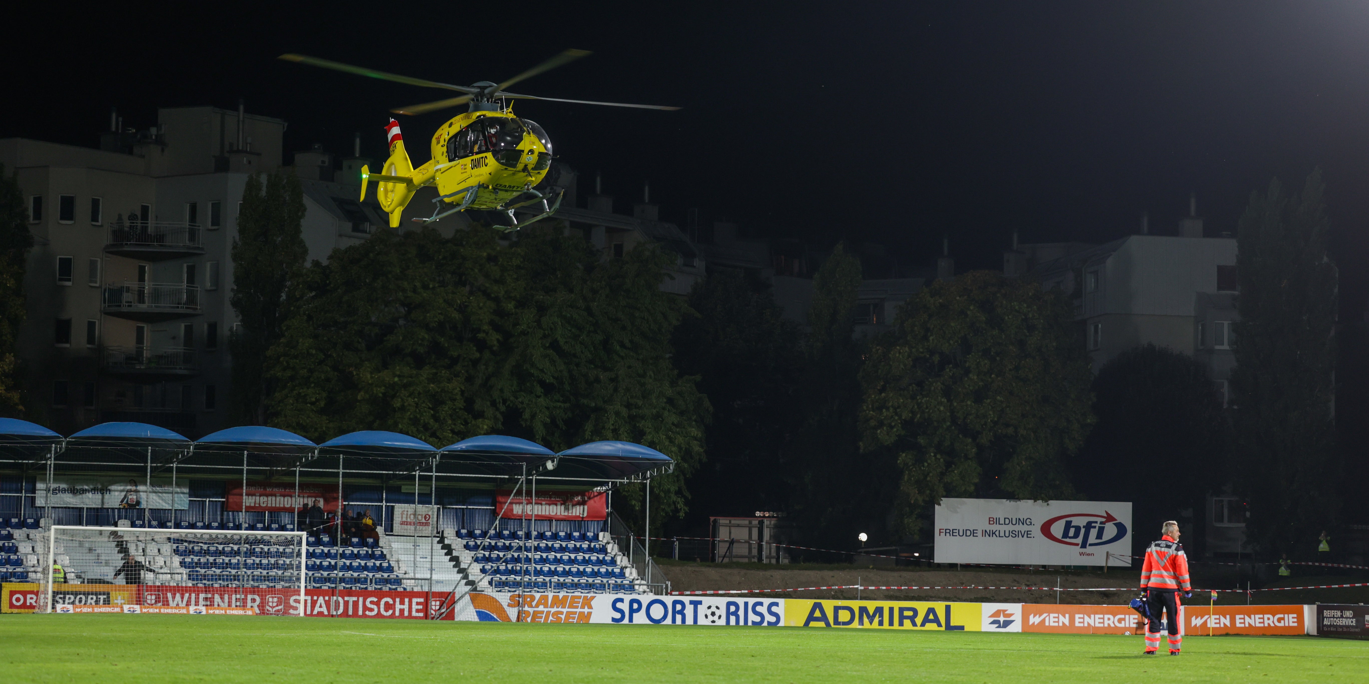So etwas sieht man auch nicht alle Tage! Im 2. Liga-Spiel im Wien-Floridsdorf zwischen dem FAC und SK Vorwärts Steyr landete mitten in der 2. Halbzeit ein Rettungshubschrauber auf dem Spielfeld des FAC-Platzes. Wie der Stadionsprecher mitteilte, handelte es sich aber nicht um einen Zwischenfall im Stadion, sondern in der Umgebung des Stadions.