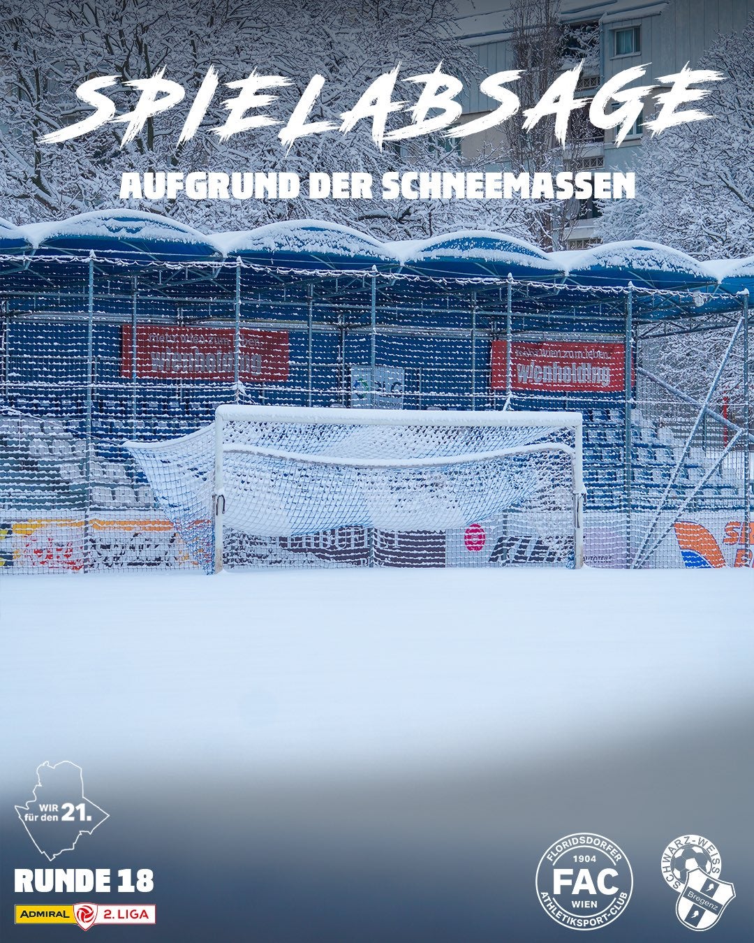 Neue Spieltermine werden "ehestmöglich" bekanntgegeben. Damit finden höchstens zwei Partien am Freitag statt. Die Vienna versucht alles, damit der Platz auf der Hohen Warte vom Schnee geräumt wird, um gegen Tabellenführer SKN St. Pölten (20.30 Uhr) antreten zu können. Fix stattfinden wird das Heimspiel von Austria Lustenau gegen Kapfenberg. "Aufgrund behördlicher Anweisungen sind die Parkplätze im Rheinvorland heute leider gesperrt. Bitte weicht auf Parkmöglichkeiten im Lustenauer Zentrum aus", verlautete der Club.