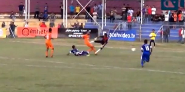 Drama in der indonesischen Superliga! In der Partie zwischen Persiraja Banda Aceh und PSAP Sigli lässt PSAP-Keeper Agus Rahman einen Schuss nach vorne abprallen. Stürmer Akli Fairuz reagiert am schnellsten, will den Ball ins leere Tor einschieben. Der heraustürmende Goalie Rahman versucht seinen Fehler auszubessern und springt dem Angreifer in Kung-Fu-Manier mit voller Wucht in den Unterleib.