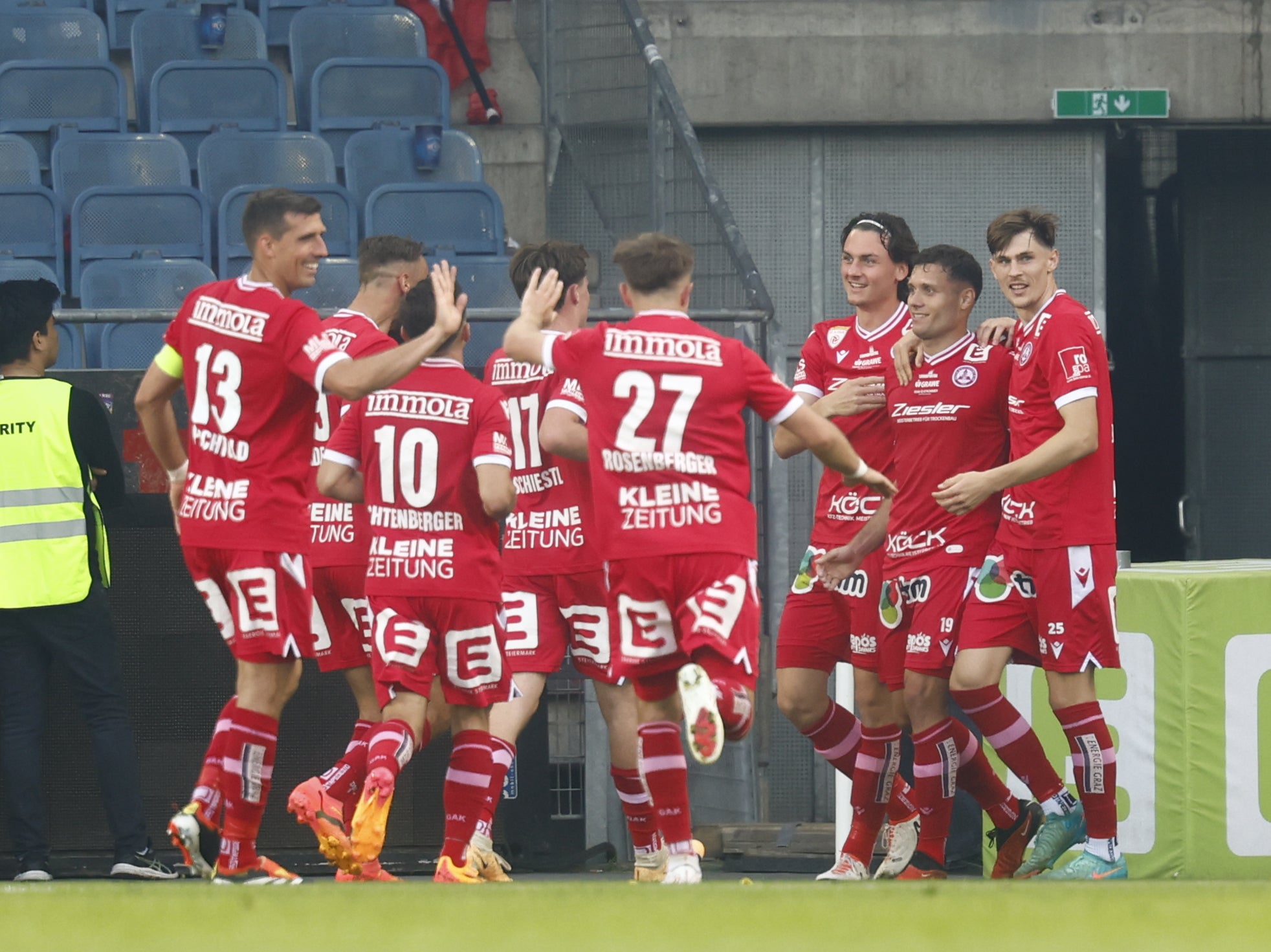Leoben besiegte Sturm Graz II mit 2:1 (1:0) und beendete die Saison auf Rang vier. Dornbirn verlor bei der SV Ried mit 0:1 (0:0) und wäre als Tabellen-14. auch sportlich abgestiegen. Beim Tabellenzweiten stand die Partie ebenfalls im Zeichen eines Abschieds. Nach 16 Saisonen bei den Innviertlern macht Marcel Ziegl Schluss, der Rieder Kapitän wurde entsprechend seiner Rückennummer 4 nach vier Minuten ausgetauscht.