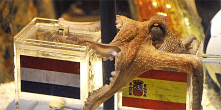 Der Tintenfisch hatte bei seinen "Vorhersagen" für die Fußball-WM immer richtig getippt: Paul konnte aus zwei gleichen Plastikbehältern mit der jeweiligen Nationalflagge eine Muschel fischen und so den Sieger der Partie vorhersagen.