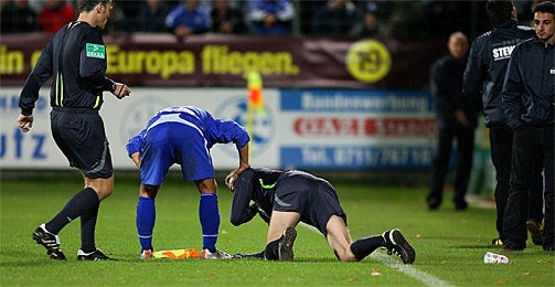 Linienrichter attackiert, Spiel abgebrochen: Hertha zum Sieger gegen Kickers erklärt. Haftbefehl gegen Becherwerfer.