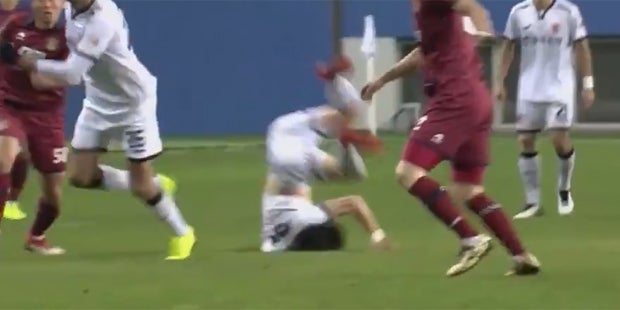 Schreckliche Szene in der zweiten koreanischen Liga beim Spiel Daejeon gegen Gwangju FC. Seung-mo Lee hebt ab und landet nach einem Luftduell unsanft auf den Boden. Der Mittelfeldmann landet mit dem Kopf zuerst, der Rest seines Körpers stürzt lose und völlig verbogen hinterher. Die Beine schleudern durch die Luft. Die Szene ist im Video kaum anzusehen.