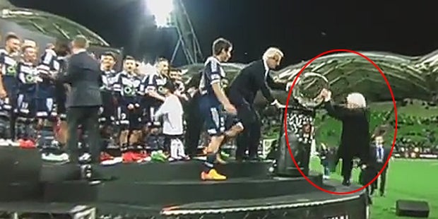 Kleines Hoppala nach dem Finale der australischen A-League. Nachdem Melbourne Victory gegen Sydney FC (mit Marc Janko) 3:0 siegreich blieb, war bereits alles für die Pokalübergabe (wie sonst in der Champions League) hergerichtet. Die Spieler warteten auf ihre Medaillen und den Pokal, als der 84-jährige Verbandsboss Frank Lowy die Bühne betrat.