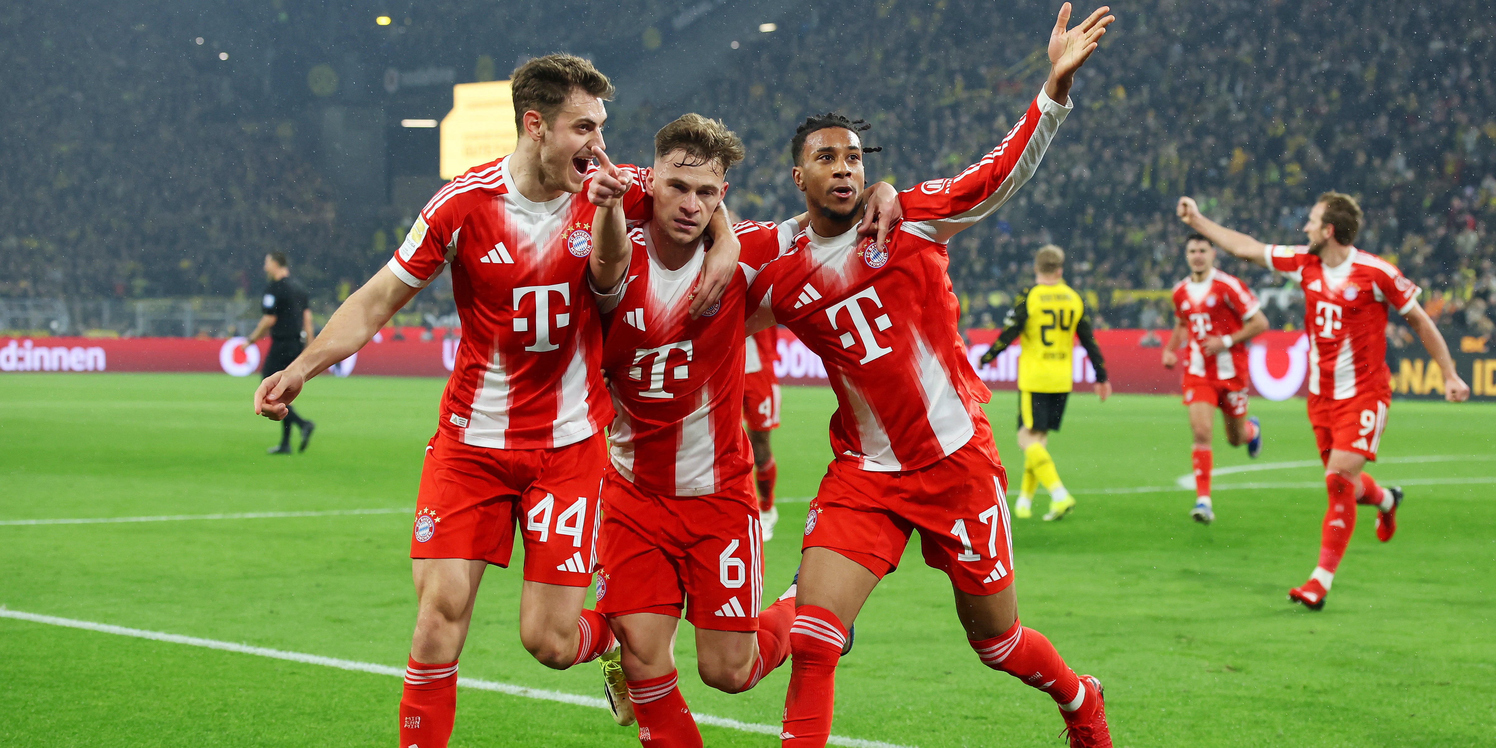 Keine zehn Minuten nach Wiederanpfiff brandete aber Jubel im Bayern-Block auf, Kane vollstreckte zum 29. Mal in dieser Saison und schoss gut eine Viertelstunde später die Gäste per Elfmeter nach Foul von Schlotterbeck gegen Stanisic in Führung. Es war der vierte Doppelpack des englischen Teamkapitäns in den jüngsten vier Ligamatches. In der Schlussphase wurde es wild. Erst traf Svensson zum Ausgleich für den BVB, dann bescherte Kimmich den Münchnern ebenfalls mit einem Volleytor den Sieg.