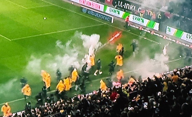 Nach 20 Minuten verließen die Gästefans das Stadion und die Polizei konnte den Platz verlassen. Dann wurde das Spiel tatsächlich fortgesetzt. Bilder auf Social Media lassen den möglichen Hintergrund für den Fan-Eklat erahnen.