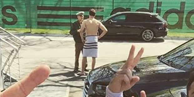 Nach dem Training wurde der nämlich prompt von einem Polizisten aus der Dusche geholt, weil sein Auto angeblich gepfändet werden sollte. Margreitter konnte das natürlich nicht fassen und ließ sich nicht zweimal bitten. Nur mit einem Handtuch bekleidet stürmt der ÖFB-Kicker zu dem Polizisten und beginnt zu diskutieren. Was er nicht weiß: Seine Kollegen versammeln sich hinter ihm und knipsen von der skurrilen Situation ein Foto. Danach erklärten sie dem vermeintlichen Unglücksraben, dass alles nur ein inszenierter Scherz war. Da der Schnappschuss des halbnackten und wild diskutierenden Margreitters viel zu schade wär, um in irgendeinem Smartphone zu versauern, postete Hanno Behrens das Foto netterweise auch gleich auf Facebook.