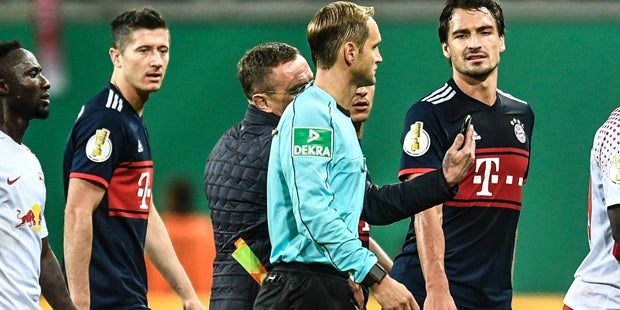 Der Steirer hatte auch für die Aktion Rangnicks wenig über. "Das geht natürlich auch nicht. Das kann in dem Fall dazu führen, dass der Schiedsrichter sich denkt: Na ja, so darf er mir nicht kommen", schilderte Hasenhüttl. Auch im Münchner Lager hatte man wenig Verständnis. "Es geht nicht, dass er mit dem Handy zum Schiedsrichter geht, um ihm Szenen zu zeigen. Sonst haben die Schiedsrichter demnächst in der Halbzeit nur noch Verantwortliche um die Ohren", sagte Bayerns Abwehrchef Mats Hummels dem TV-Sender Sky.
