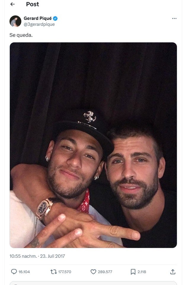 Fußballfans kennen die Anspielung: 2017 postete Gerard Piqué fast identisch ein Bild mit Neymar – nur neun Tage später wechselte der Brasilianer für 222 Millionen Euro zu Paris Saint-Germain.