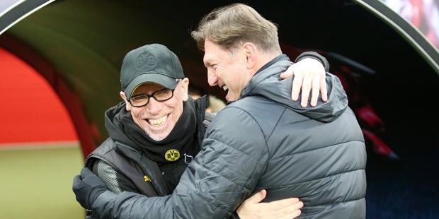 Nach dem Offensivspektakel im Topspiel nahmen Ralph Hasenhüttl und Peter Stöger die jüngste Kritik mit Humor. "Wir haben gerade geflachst: Für Beamten-Fußball wart ihr ganz schön flott unterwegs", sagte RB Leipzigs Coach Ralph Hasenhüttl nach dem 1:1 gegen Borussia Dortmund mit verschmitztem Grinsen. "Für Krise auch", erwiderte BVB-Kollege Stöger.