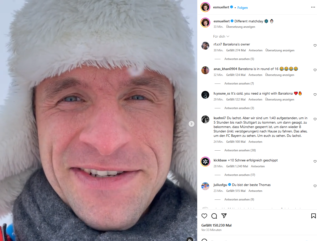 Bayern-Star Thomas Müller nahm die Absage mit Humor und postete auf Instagram ein Video, das ihn beim Schneeschaufeln zeigt. "Ich verstehe überhaupt nicht, warum das Spiel heute ausgefallen ist", kommentiert der deutsche Nationalspieler dabei heiter.
