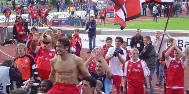Oli Kahn, ehemaliger Torwart-Titan des FC Bayern, ist auf Twitter sehr aktiv. Jetzt hat er seine Follower mit einem alten Foto erheitert. Er postete einen 13 Jahre alten Schnappschuss einer Meisterfeier seiner Bayern. Darauf zu sehen sind Kahn selbst, Bixente Lizerazu, Samy Kuffour, Roy Makaay und noch einige weitere damalige Bayernspieler. Aber um die "Alt-Stars" geht es gar nicht, denn Kahn hat auf dem Foto einen späteren Weltmeister entdeckt, der als junger Bub mit den Stars mitfeierte. Thomas Müller feierte mit Kahn & Co.