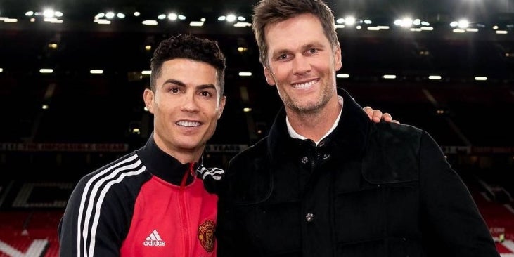 Nach seinem Dreierpack für Manchester United beim 3:2-Sieg gegen Tottenham Hotspur am Samstag posierte Cristiano Ronaldo auf dem Rasen des Old Trafford für ein Foto mit NFL-Legende Tom Brady, der unter den Zuschauern war. "Immer eine Freude und ein Privileg, sich mit einem anderen GOAT auszutauschen", schrieb Ronaldo dazu ganz unbescheiden bei Twitter und Instagram. Die Abkürzung GOAT steht für "Greatest Of All Time" (deutsch: Größter aller Zeiten).