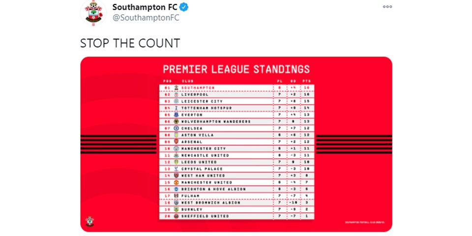 Nach acht Runden ist Southampton überraschend vor Liverpool führender Club. Auf Twitter forderten sie, wie der Noch-US-Präsident: "Stoppt die Zählung".