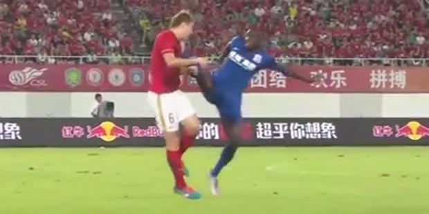 Unglaubliche Aktion von Demba Ba in China! Der ehemalige Chelsea-Kicker tritt im Spiel seines neuen Klubs Shanghai Shenua seinen Gegenspieler ganz übel um. Nach einem langen, hohen Pass in die Spitze konzentriert sich der Stürmer nur auf den Ball, will sich die Kugel mit gestrecktem Bein stoppen und trifft dabei seinen Gegenspieler mit voller Wucht!