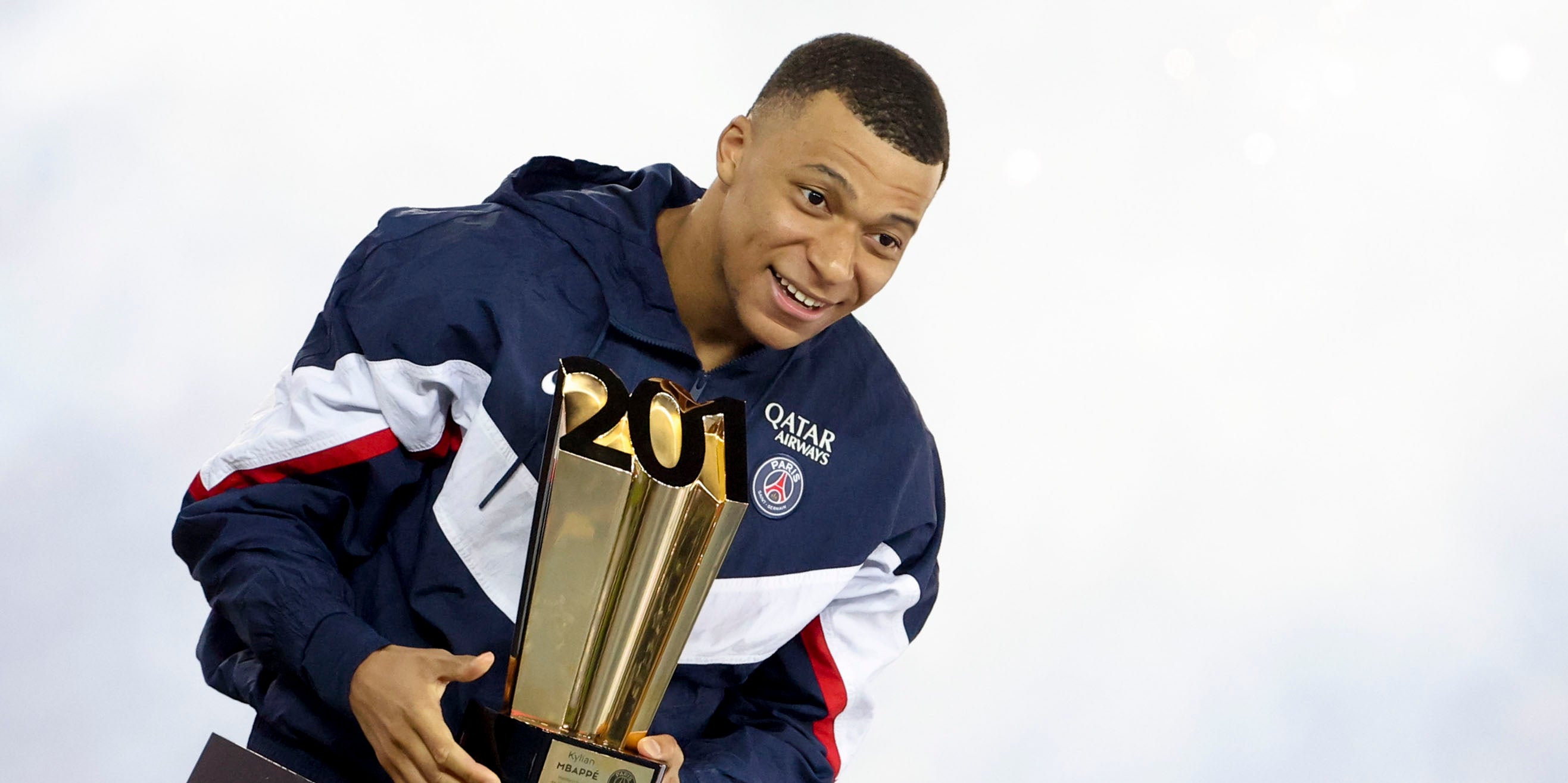 Stolz hielt Fußball-Superstar Kylian Mbappe die ungewöhnliche Gold-Trophäe mit der Zahl 201 in die Höhe.