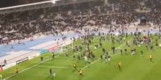 Nachdem zunächst "Bengalos" in Richtung Spielfeld geworfen wurden, endete das Fan-Chaos in einem Platzsturm.
