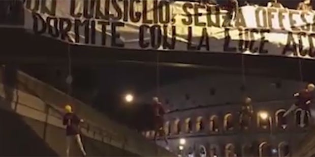 In Rom hat eine makabere Aktion für Aufsehen gesorgt. In der Nacht auf Freitag hatten Unbekannte Puppen mit Trikots dreier Fußballspieler der AS Roma von einer Brücke vor dem Kolosseum gehängt, wie auf Bildern und Videos zu sehen war. Dazu war ein Banner mit der Drohung zu sehen: "Nehmt den guten Ratschlag an: Schlaft mit Licht an."