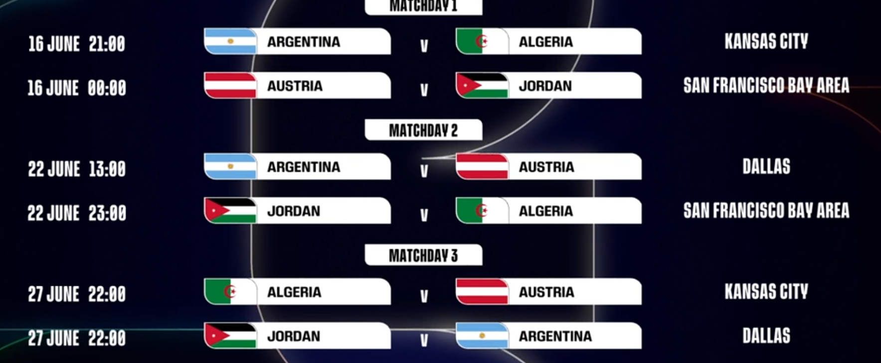Den Auftakt bestreiten ÖFB-Rekordtorschütze Marko Arnautovic und Co. am 17. Juni (06.00) in San Francisco gegen Jordanien. Der Schlager gegen Titelverteidiger Argentinien mit Lionel Messi folgt am 22. Juni (19.00) in Dallas. Zum Abschluss steht am 28. Juni (04.00/alles MEZ) das Duell mit Algerien in Kansas City an.