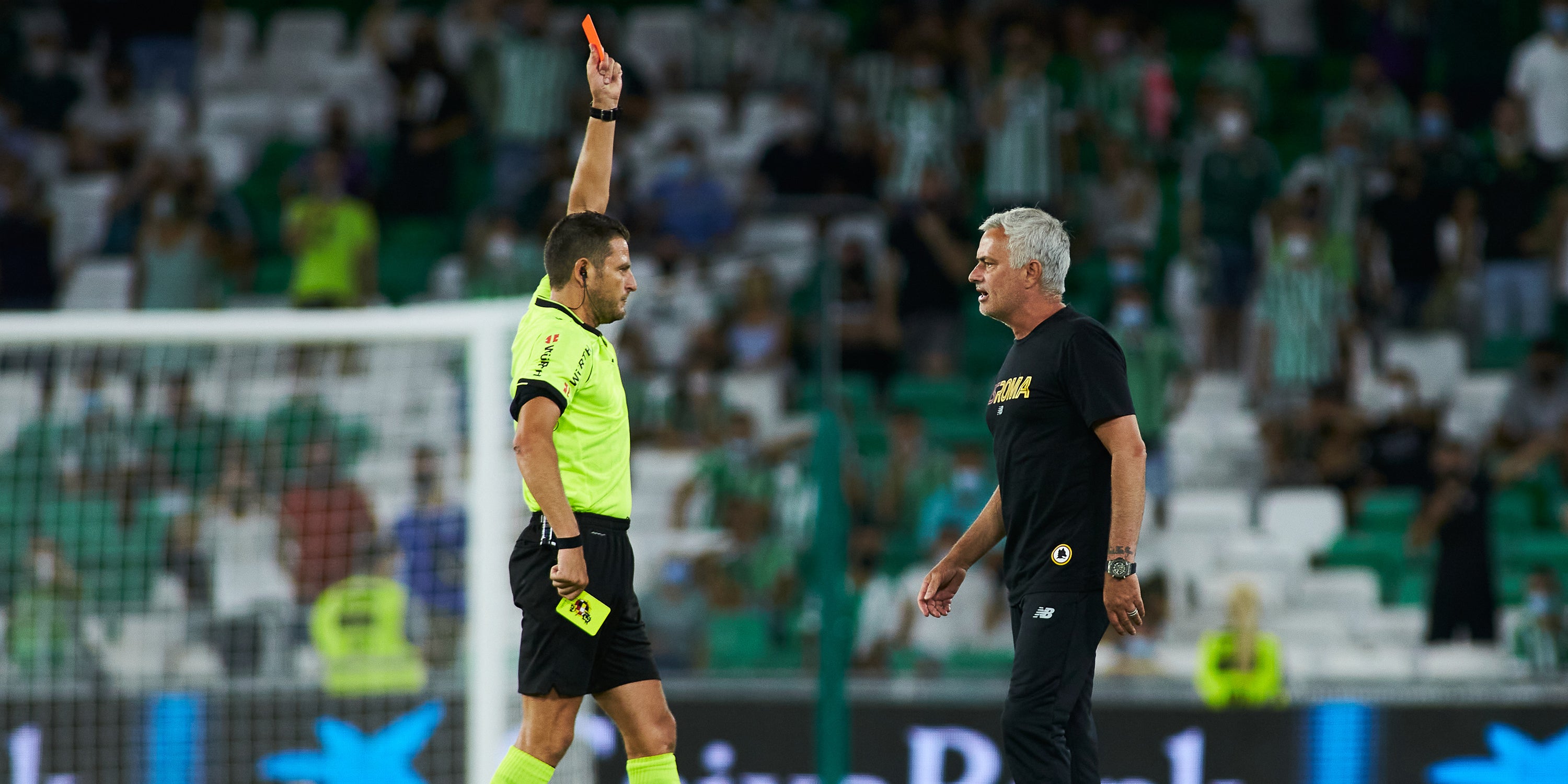 Lorenzo Pellegrini and José Mourinho are sent off after watching a Real Betis player score an allowed goal with his hand. pic.twitter.com/HI0K6kf0XP