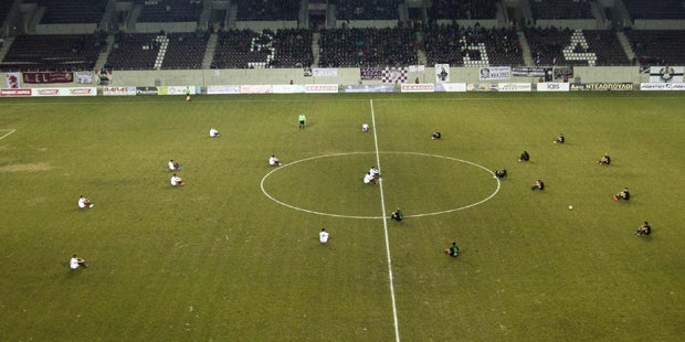 Fußballer zweier gegnerischer Klubs der zweiten griechischen Liga haben zu Beginn einer Partie in der Stadt Larissa mit einem Sitzprotest an die vielen im Mittelmeer ertrunkenen Flüchtlinge erinnert.