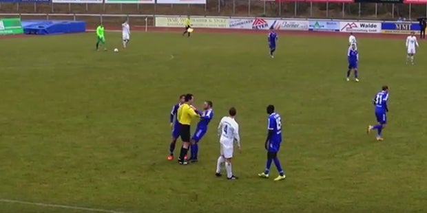 Unparteiischer verliert die Nerven geht auf den meckernden Spieler los.