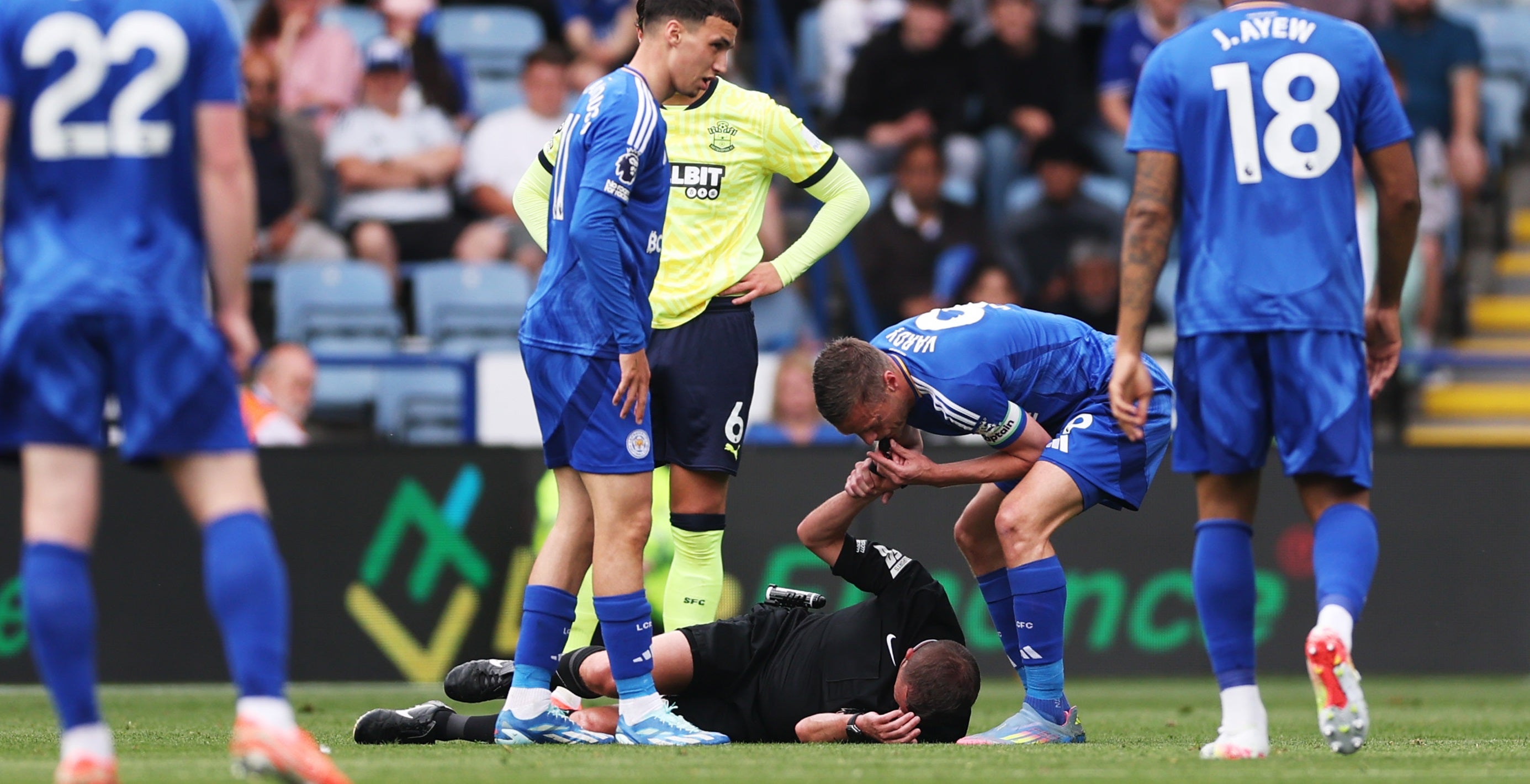 Als sich David Webb in der ersten Halbzeit nach einem Zusammenstoß mit Leicesters Jordan Ayew mit der Pfeife in der Hand am Boden krümmte, spielten einige Profis weiter. Da eilte Vardy zum Schiedsrichter, bückte sich, griff nach Webbs Arm und dann kurzerhand selbst zur Pfeife.