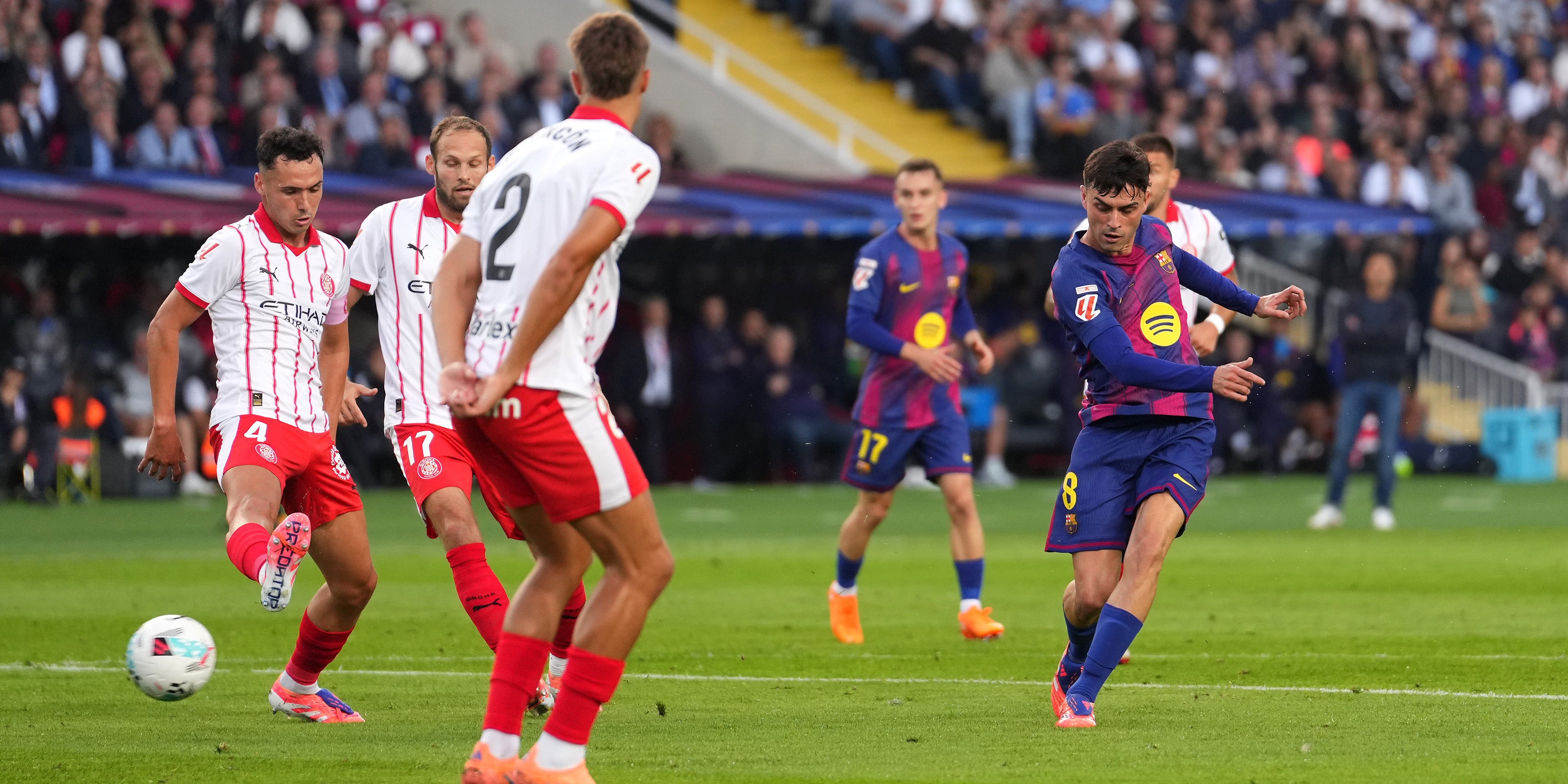 Barcelona war in der 13. Minute in Führung gegangen, als Pedri einen Pass von Lamine Yamal im Strafraum erhielt, die Abwehrreihe überlief und mit dem linken Fuß flach ins Tor traf. Sieben Minuten später gelang Axel Witsel mit einem spektakulären Fallrückzieher der Ausgleich für Girona. Am Ende wurde es turbulent, kurz vor dem Tor flog Flick vom Platz. Der Deutsche hatte die aus seiner Sicht zu gering angezeigte Nachspielzeit kritisiert.