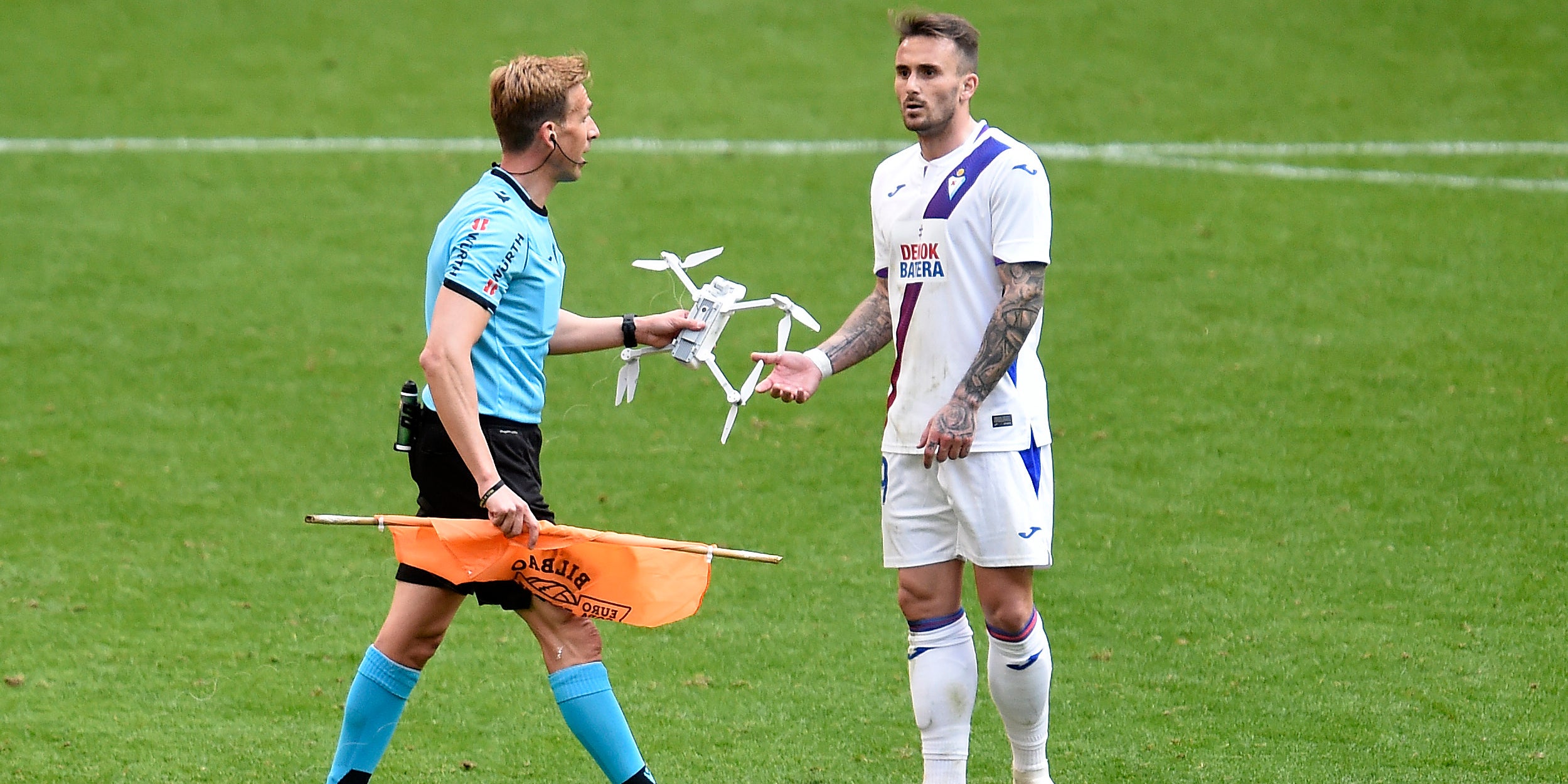 Eine Drohne mit einer Botschaft gegen Fußball-EM-Spiele in Bilbao hat am Samstag für eine kurzfristige Unterbrechung des spanischen Ligaspiels zwischen Athletic Bilbao und Eibar (1:1) gesorgt. Die Begegnung wurde in der 68. Minute angehalten, während der Schiedsrichter das Flugobjekt mitsamt der angehängten Fahne vom Spielfeld trug.