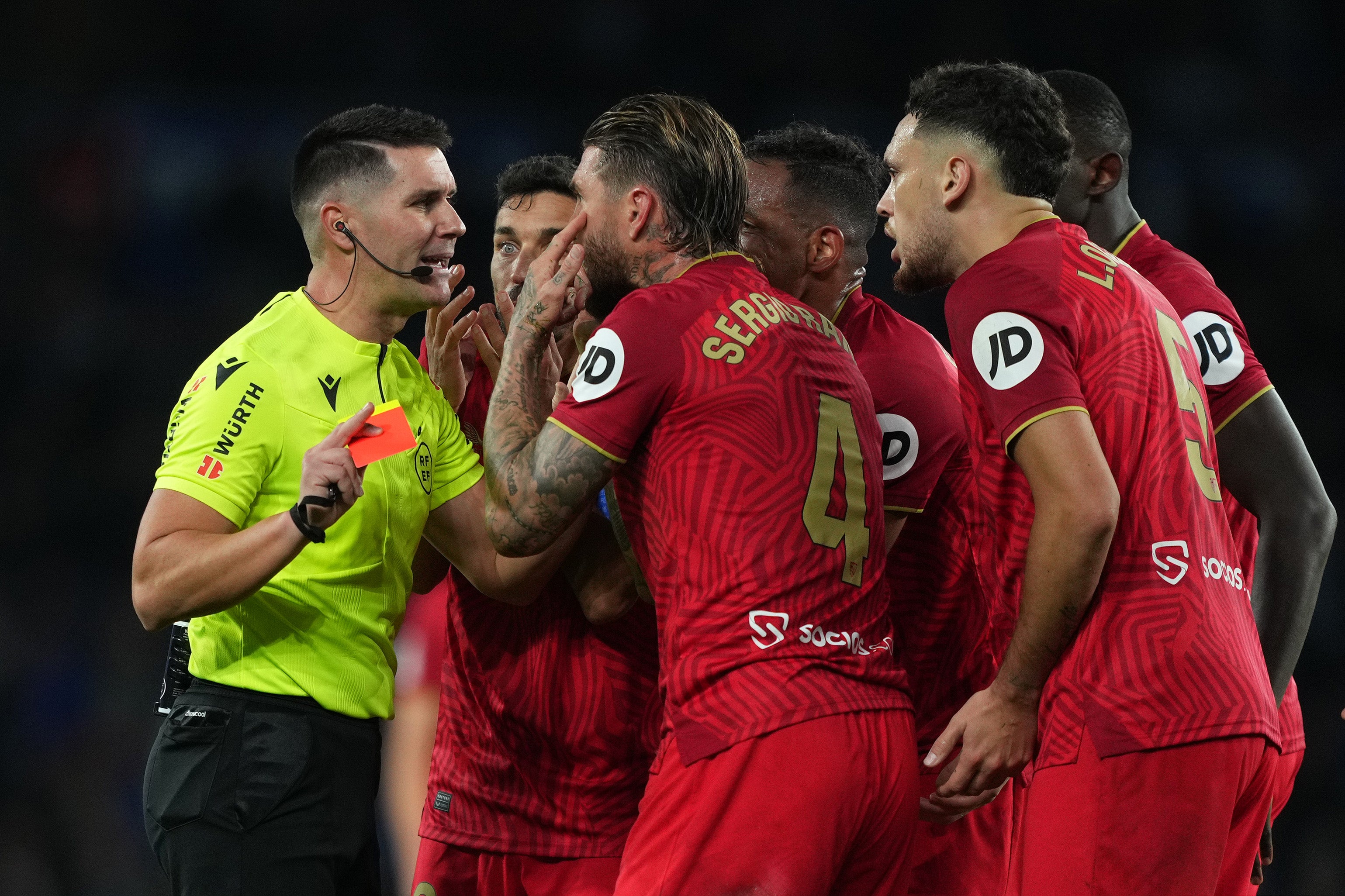 Die 86. Spielminute im Meisterschaftsspiel gegen Real Sociedad läuft: Ramos mäht mit gestreckten Bein den durchbrechenden Sociedad-Star Brais Méndez um. Zunächst zeigt Schiedsrichter Miguel Ángel Ortiz Arias dem bereits verwarnten Sevilla-Abwehrboss die Gelb-Rote-Karte. Ramos wäre damit noch gut bedient gewesen.