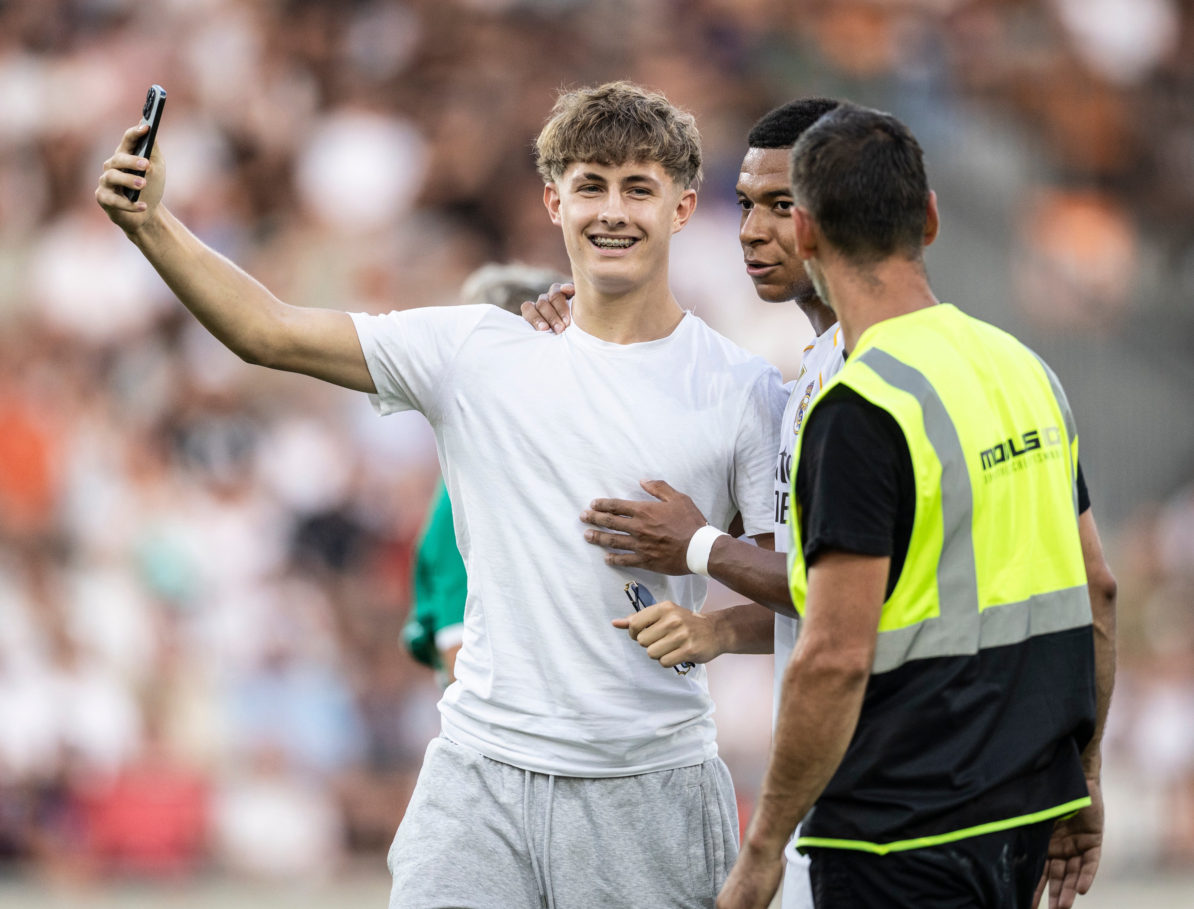 Nicht viele können von sich behaupten, während eines Fußballspiels mit Erfolg auf den Platz gestürmt zu sein und dort ein Bild mit einem absoluten Superstar ergattert zu haben. Am Dienstag beim Testspiel zwischen der WSG Tirol und Real Madrid wurden die rund 15.700 Zuschauer im Tivoli Stadion, Zeuge davon, wie sich ein Flitzer genau diesen Traum erfüllte. Ein Fan war kurz vor dem Halbzeitpfiff auf den Rasen gelaufen und schaffte es, trotz Security, ein Selfie mit Real-Superstar Kylian Mbappé zu knipsen. Laut Tiroler Tageszeitung handelt es sich dabei um Noah Glantschnig, der selbst Kicker beim Regionalligisten Silz/Mötz ist.