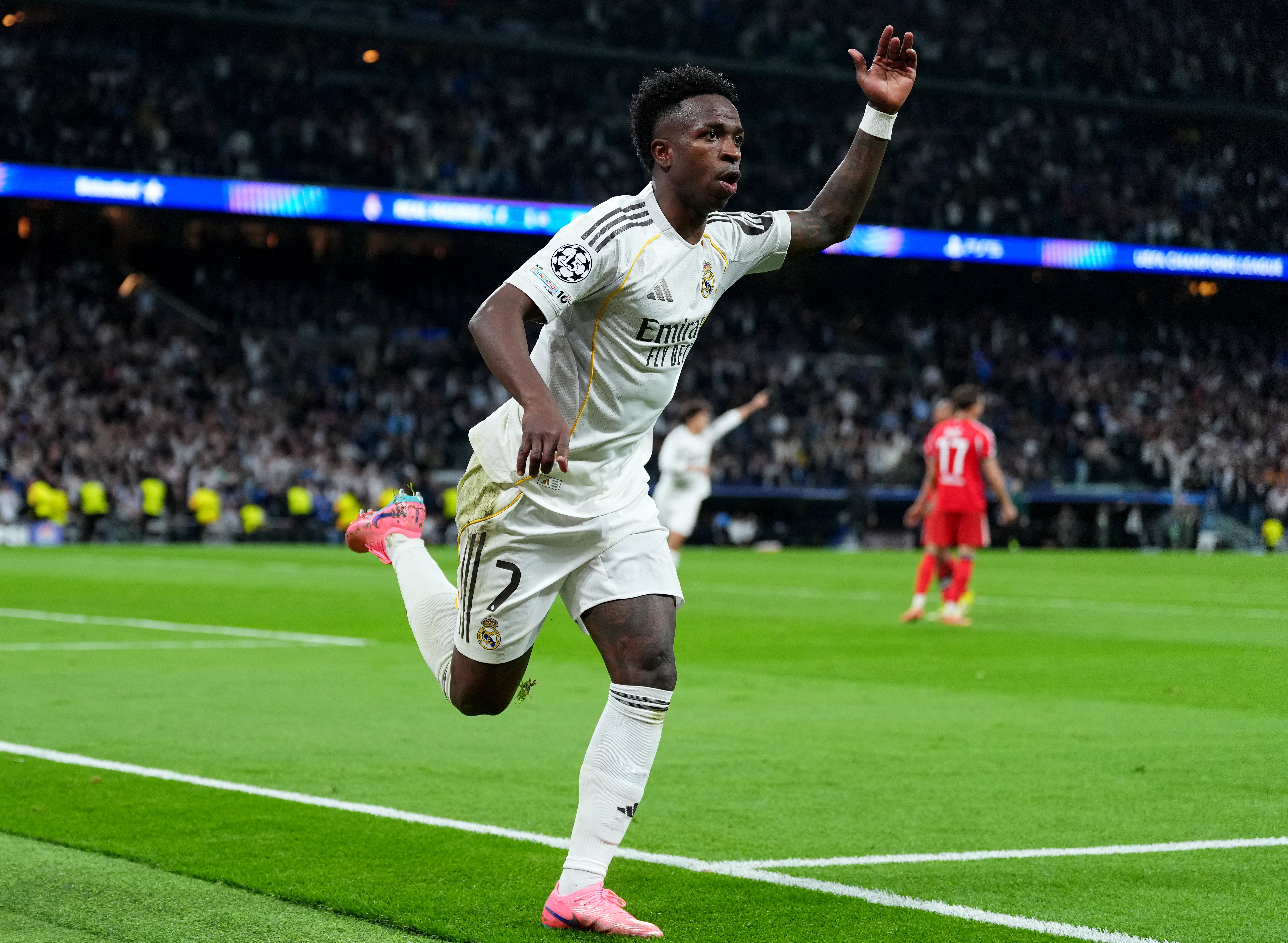 Ausgerechnet Vini Junior! Der Siegtreffer-Schütze ließ es sich nicht nehmen, das Tor mit einem Tänzchen zu feiern. Was wohl der gesperrte Prestianni (hatte den Brasilianer angeblich rassistisch beleidigt) vorm TV dabei gedacht hat ...