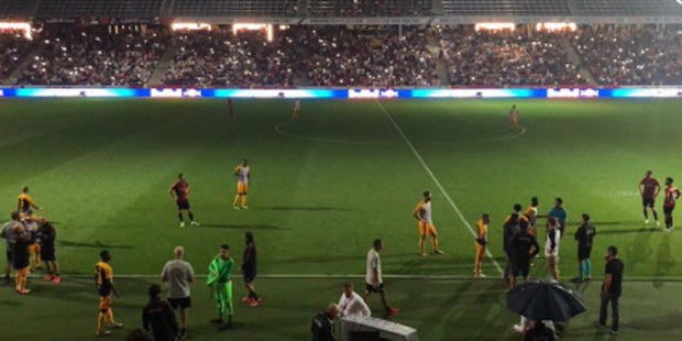 Im Stadion fiel nach einem Bitzeinschlag sogar der Strom aus. Daraufhin musste das Spiel selbst ebenfalls für wenige Minuten unterbrochen werden.