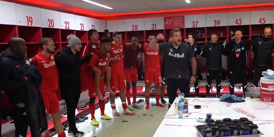 Die Spieler flippen nach der Ansprache aus und lassen ihrer Feierlaune freien Lauf samt Bierdusche für den Redner. Der FC Salzburg stellte die Szene später auf Twitter und beschrieb die Aufnahme passend mit: "Ausrasten in 3,2,1 !!!!!"