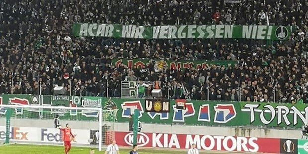 Rapid-Fans mit Anti-Polizei-Spruchband beim Euro-League-Spiel.