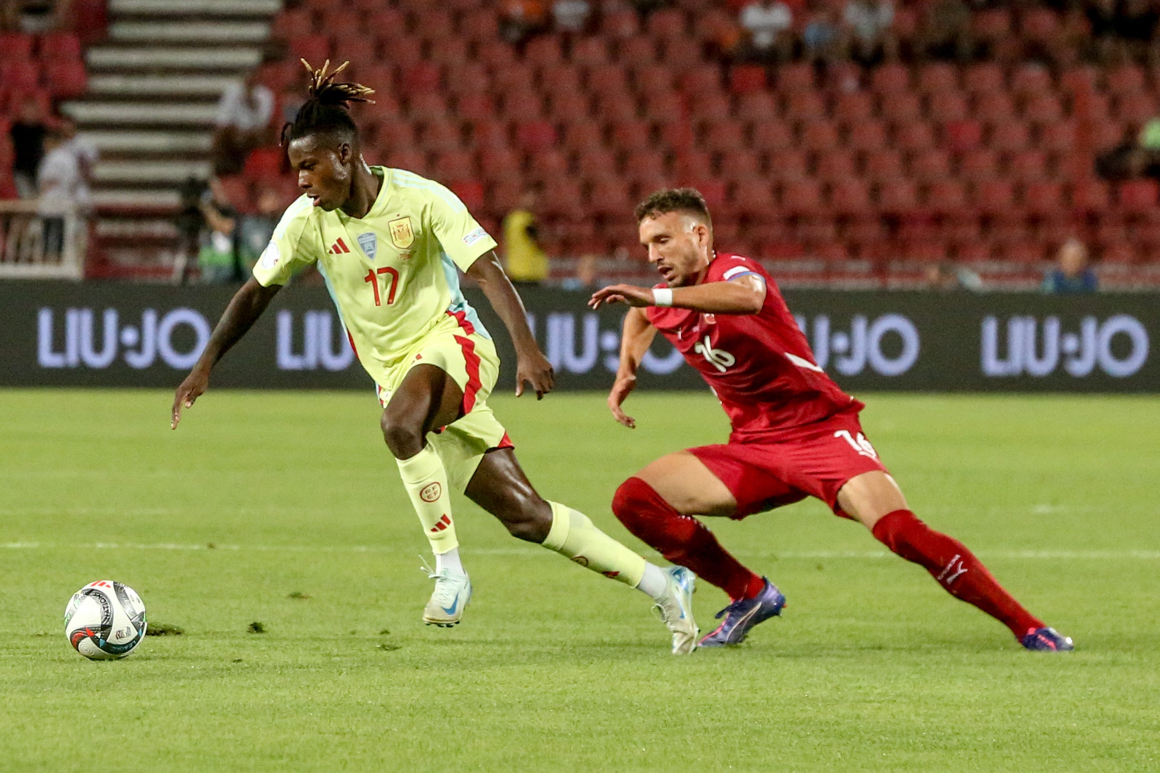 Danach sei es deutlich besser gelaufen, man habe aber die nötige Effizienz vermissen lassen. "Wir hätten es besser machen können, die Spieler waren ein bisschen müde, die Hitze war unerträglich, uns ist das Benzin ausgegangen", resümierte Spaniens Teamcoach. Bei einem Ballbesitz von 68:32 Prozent und einem Schuss-Plus von 22:9 hätte jedenfalls für Lamine Yamal und Co. mehr herausschauen können. So ist Dänemark nach einem 2:0-Sieg über die Schweiz der erste Leader in der Gruppe A4. Am Sonntag sind die Spanier in Genf zu Gast, die Dänen treten da in Kopenhagen gegen Serbien an.