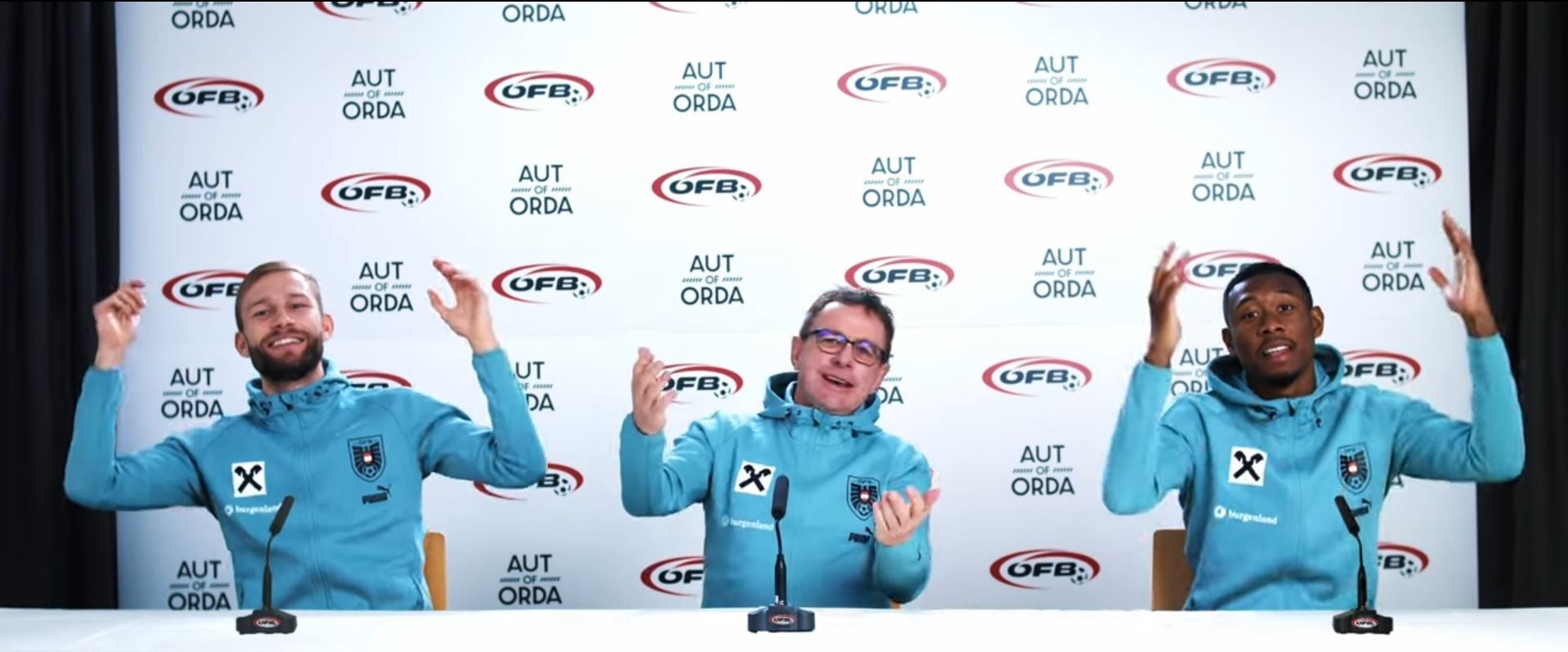 Das Trio hatte im Februar bereits die Single "Wigl Wogl" herausgebracht. Gemeinsam mit ÖFB-Teamchef Ralf Rangnick präsentierten Seiler, Pizzera und Fellner am Donnerstag in Linz ihr neuestes Werk. Das Video beginnt mit einem Einbruch der Protagonisten ins Ernst-Happel-Stadion, neben Rangnick kommen auch die ÖFB-Stars David Alaba und Konrad Laimer zu Wort. "Des is die nächste deppade Frog", darf der Deutsche Rangnick ebenfalls auf ein legendäres TV-Interview Bezug nehmen.