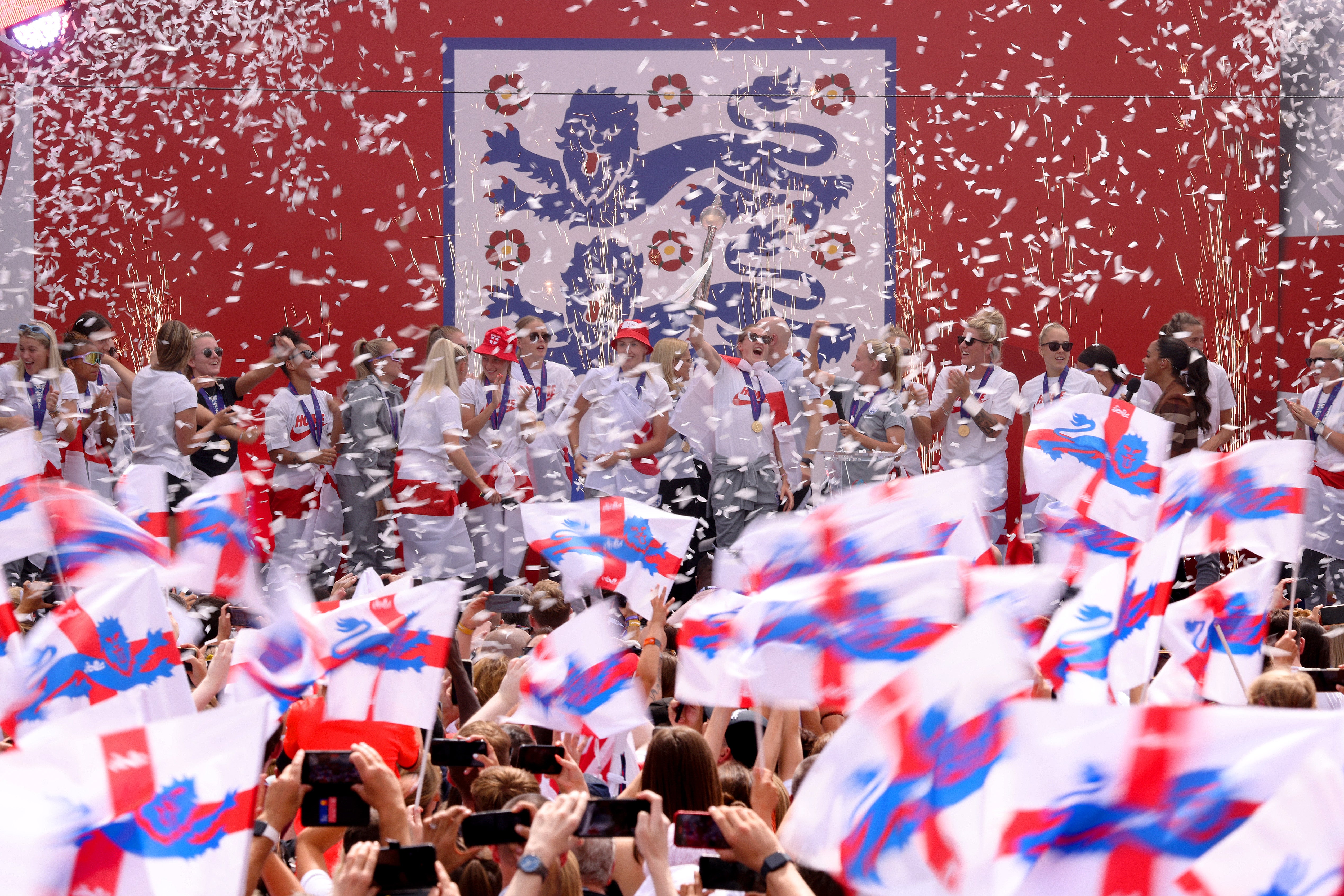 England kann nicht nur stolz auf ihr Siegerteam sein, sondern auch auf die gesamte Austragung des Turniers. Mit 87.192 Zuschauern wurde am Sonntag die höchste EM-Zuschauerzahl aller Zeiten bei einem Damen-EM-Spiel erreicht. Damit kamen mehr als doppelt zu viele Fans zu den Spielen als noch bei der letzten Europameisterschaft 2017. Auch die mediale Präsenz ist nicht mit vor fünf Jahren vergleichbar. Die Spielerin des Turniers Beth Mead und ihre Teamkolleginnen waren auf Englands Titelseiten omnipräsent.